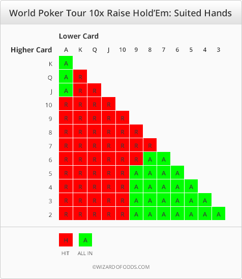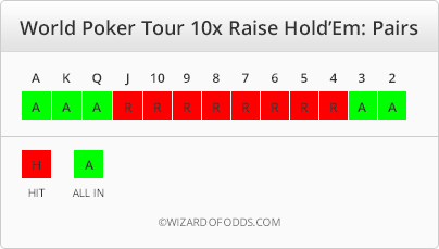 World Poker Tour All-In Hold'em is poker based table game found at many of the MGM/Mirage casinos in Las Vegas. There are two versions, both with the same name. In one, the player can raise up to 3X hit ante, and in the other, up to 10X his ante. In the version addressed on this page, the player can raise up to 10X his ante bet. See World Poker Tour 3X Raise Hold 'Em, for the other 3X version. The rules are very true to real poker and the Element of Risk is only 0.23%.