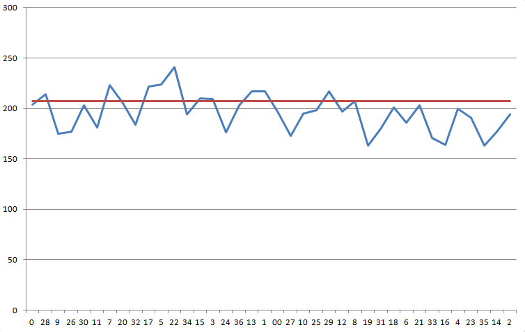 The following graph shows your results in sequential order on the wheel. The blue line shows your results. The red line is the number you need, 207.11, to overcome the 5.26% house edge.