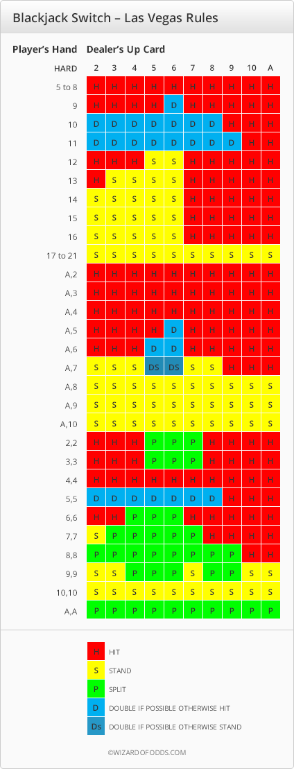 The following tables show the basic strategy under the 8-deck Las Vegas rules after the switch decision has been made. The reason for the differences compared to conventional blackjack strategy is the push on 22 rule.