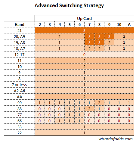 The following is the "Cindy Liu Advanced Switching Strategy," appropriate under the Las Vegas rules. To use it, add up the points for each hand for both ways to play them, and play the one with the greater number of points. In the case of a tie, use the the simple strategy.