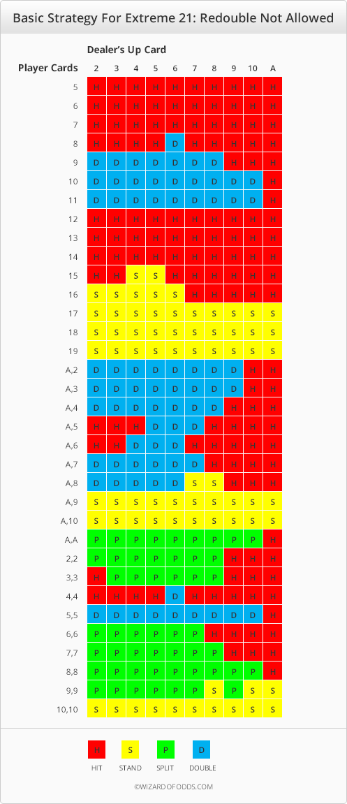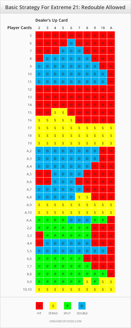 The following table shows the basic strategy for Extreme 21 if redoubling is allowed.