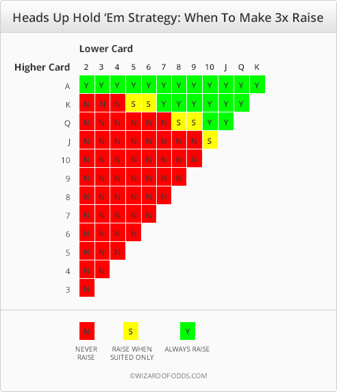 The player should make the 3X raise with any pair except deuces. Otherwise, use the following table shows when to make the large 3X raise.