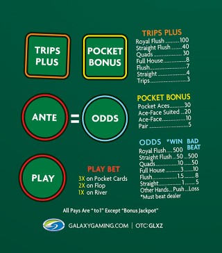 Hand Pay Table 1 2 3 4 Straight Flush 500 500 500 500 Quads 50 50 50 25 Full House 10 10 10 6 Flush 8 6 5 5 Straight 5 5 4 4 All Other Loss Loss Loss Loss - In addition, there are two side bets, that pay based on the player's cards only, the Trips Plus and Pocket Bonus. These side bets are explained after the analysis of the base game.