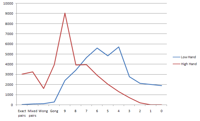 - If both player and dealer have a Wong, Gong, or 1 to 9 points, the tie will be broken according to which hand has the higher-ranked high tile.