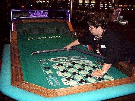 Ricochet is a dice game formerly found at the Fiesta Henderson. I hear it was removed in July 2006. The game uses three dice and is played on a small table with chairs. Many bets are available, some that resolve in one roll, and other may take several. I have had to make up some terminology to explain this game, which may not be consistent with what the owners intended.