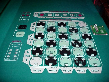 Most of the betting layout is all 30 cominations of a pair and a singleton. Players may bet that any chosen combination will be rolled before the player craps out (for lack of a better term) by throwing one of turn ending combinations listed above. As in roulette the player may straddle two or four bets as well. There are also single roll bets. The following list explains all the available bets.