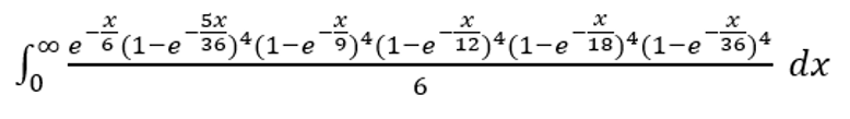 To put it in text form: exp(-x/6)*(1-exp(-5x/36))^4*(1-exp(-4x/36))^4*(1-exp(-3x/36))^4*(1-exp(-2x/36))^4*(1-exp(-1x/36))^4/6