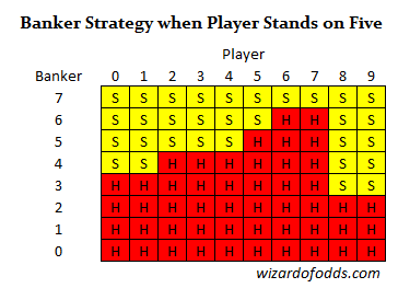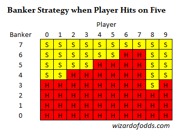 The Banker strategy is to play the same way as the Player. In other words, if the Player hits a five, then the Banker should hit in all four other situations listed. Meanwhile, the Player should play the opposite way the Banker tends to play the four strategy-dependent situations listed.
