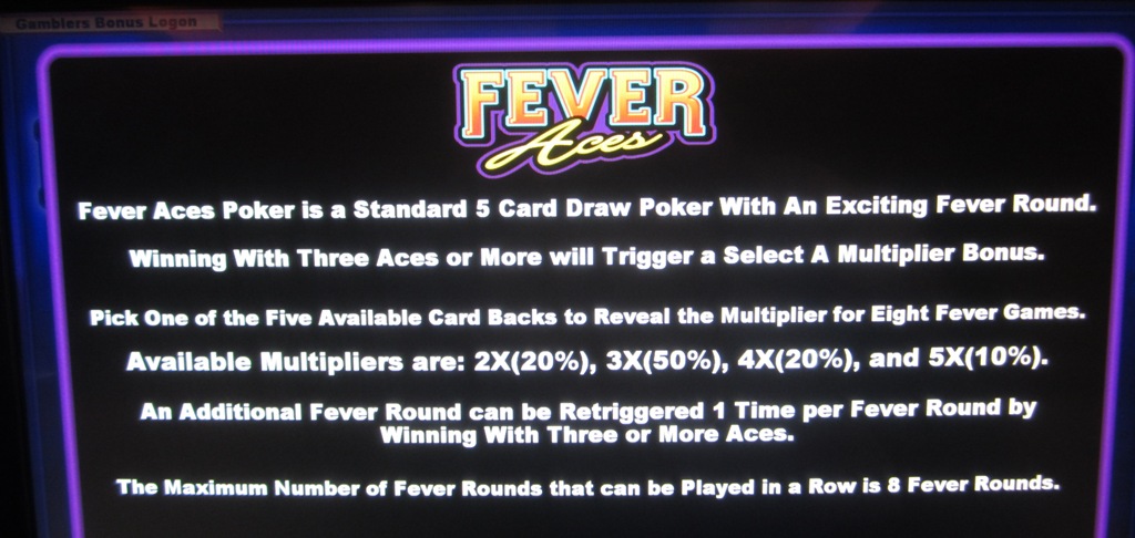 Fever Aces is a video poker game that can be found at some bars and restaurants in Nevada. I believe it can be found at those locations that offer the Gamblers Bonus reward program.