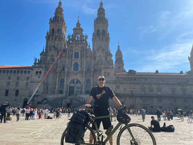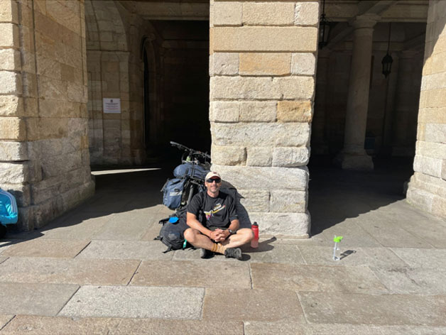 As I drew closer, the crowds got thicker and the shops more touristy. Then I heard the sound of bagpipes. From this point, everybody, including me, got quiet as we all followed the bagpiper’s siren call. A few more turns and we were at the Cathedral wall, but obviously not at the main square where the Camino officially ends. Then we all came to some steps that lead to a passageway underneath a part of the Cathedral. In this passageway was the man blowing his bagpipes. In this echo chamber they were very loud. I went straight through as this passage was crowded and my bicycle would have encumbered traffic had I stayed to listen to the bagpipes or contemplate my last steps of the journey.