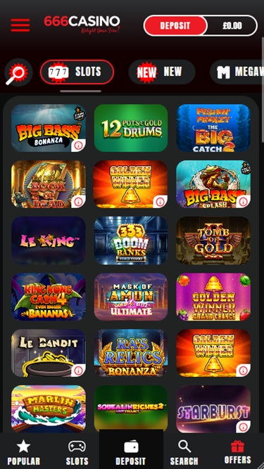 666 Casino is powered by Amaya, Microgaming, Net Entertainment, BetSoft, 1x2gaming, Amatic Industries, Barcrest, Big Time Gaming, Evolution Gaming, EYECON, Ezugi, iSoftBet, lightningboxgames, Oryx, Play'n GO, playson, Quickspin, Yggdrasil, Wazdan, Booming Games, Stakelogic, Pragmatic Play, Red Tiger Gaming, Spinomenal, Red Rake Gaming, Skillzzgaming, SYNOT Games, Skywind, Triple Edge Studios, Northern Lights Gaming, Stormcraft Studios, Switch Studios, Electric Elephant Games, All41 Studios, Gluck Games, Gameburger Studios, Pulse 8 Studios, Neon Valley Studios, Shuffle Master, SpinPlay Games, Real Dealer Studios, GONG Gaming, Buck Stakes Entertainment, Games Global, Wizard Games, Bally Technologies, bluberi, Blueprint Gaming, Endemol Games, Greentube, NextGen, Pariplay, WMS, Inspired Gaming, Gaming Realms, SG Interactive, Red7Mobile, Scientific Games, Reel Time Gaming, Authentic Gaming, betiXon, Bally Wulff, Iron Dog Studio, Old Skool Studios, Foxium, Betdigital, Just For The Win, Reflex Gaming, PearFiction Studios, Wild Streak Gaming, Slingshot Studios, Fortune Factory Studios, RubyPlay, 4ThePlayer, AvatarUX, Gamevy, Crazy Tooth Studio, High 5 Games, ReelPlay, Alchemy Gaming, Snowborn Games, Hacksaw Gaming, Gold Coin Studios, Bang Bang Games, Half Pixel Studios, Peter And Sons, Aurum Signature Studios, Lucksome Gaming, Area Vegas, Leap Gaming, Wishbone Games, Spribe, HammerTime Games, Nailed It! Games, Atomic Slot Lab, Neko Games, Reel Kingdom, Oros Gaming, Indigo Magic and Light & Wonder and the casino’s games are offered through a web-based instant play platform. This means that the site loads through your favorite internet browser, rather than making you download software. You can also play on your smartphone, as 666 supports mobile play.