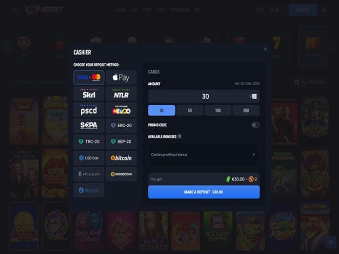 Regarding payment methods, you can use several banking options to manage your funds at Aerobet, including Visa, Mastercard, Skrill, MiFinity, Apple Pay, Paysafecard, and MB Way. The brand also accepts several cryptocurrencies like Bitcoin, Dogecoin, Ethereum, Litecoin, USD Coin, and Tether.