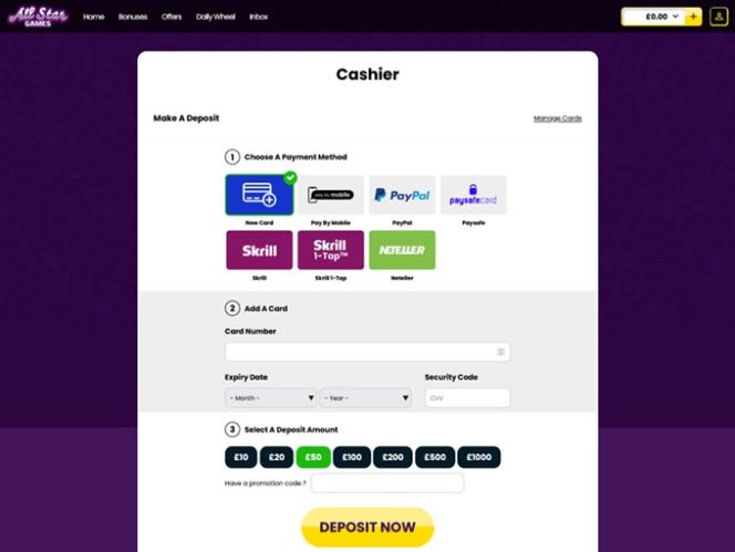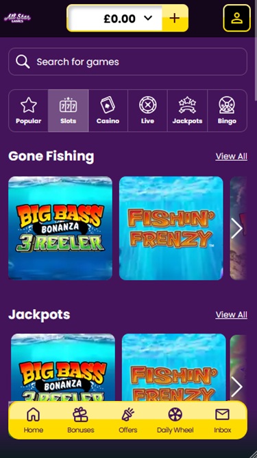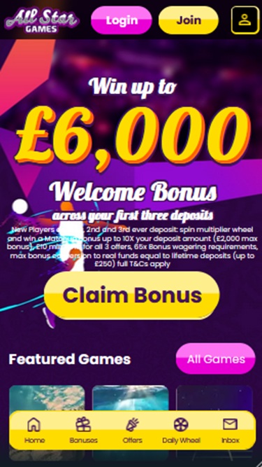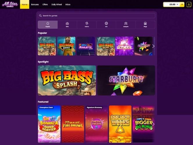 All Star Games is powered by Microgaming, Net Entertainment, Playtech, 1x2gaming, Barcrest, Big Time Gaming, ELK Studios, EYECON, lightningboxgames, Oryx, Play'n GO, playson, Quickspin, Rabcat, Saucify, Thunderkick, Yggdrasil, Realistic Games, Booming Games, Pragmatic Play, Nolimit City, Red Tiger Gaming, Spinomenal, Red Rake Gaming, Fantasma Games, Spin Games, Skywind, Triple Edge Studios, Northern Lights Gaming, Fazi, Stormcraft Studios, Switch Studios, Bulletproof Games, All41 Studios, Gluck Games, Gameburger Studios, Pulse 8 Studios, Neon Valley Studios, Golden Rock Studios, Shuffle Master, SpinPlay Games, Real Dealer Studios, GONG Gaming, Blue Guru Games, On Air Entertainment, Buck Stakes Entertainment, Design Works Gaming, Games Global, 2by2 Gaming, Ainsworth, Ash Gaming, Bally Technologies, bluberi, Blueprint Gaming, Jumpman Gaming, Leander Games, Merkur Gaming, NextGen, Tom Horn Gaming, WMS, Inspired Gaming, Gaming Realms, Genii, SG Interactive, Gamomat, Red7Mobile, Scientific Games, Reel Time Gaming, Authentic Gaming, Iron Dog Studio, Old Skool Studios, Foxium, Betdigital, Just For The Win, The Games Company, Storm Gaming Technology, MetaGU, PearFiction Studios, Wild Streak Gaming, Slingshot Studios, Fortune Factory Studios, Jade Rabbit Gaming, 4ThePlayer, AvatarUX, Gamevy, Crazy Tooth Studio, High 5 Games, ReelPlay, Alchemy Gaming, Rarestone Gaming, Snowborn Games, Boomerang Studios, Hacksaw Gaming, Max Win Gaming, Gold Coin Studios, Half Pixel Studios, Peter And Sons, Aurum Signature Studios, Lucksome Gaming, Area Vegas, RAW iGaming, Wishbone Games, HammerTime Games, INO Games, Nailed It! Games, Atomic Slot Lab, Neko Games, Reel Kingdom and Light & Wonder, and the casino’s games are provided via a web-based instant play platform that loads games directly through your internet browser. The site also supports mobile gaming, which allows you to play through your smartphone or tablet.