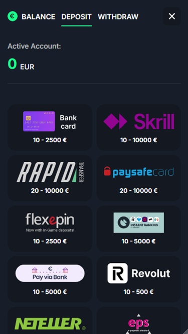 💸 Min Withdrawal€10 (Crypto/E-wallets)/€20 (Credit/Debit Cards)