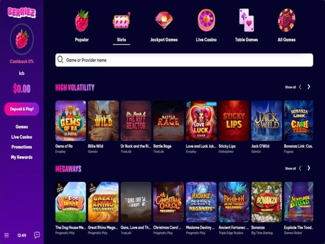 Berriez features a robust library of games powered by Microgaming, Net Entertainment, BetSoft, Big Time Gaming, Evolution Gaming, EYECON, Habanero Systems, Novomatic, Play'n GO, playson, Relax Gaming, Yggdrasil, Endorphina, Wazdan, Booming Games, Stakelogic, Pragmatic Play, Nolimit City, Red Tiger Gaming, Fugaso, Fantasma Games, Triple Edge Studios, BGAMING, Northern Lights Gaming, Evoplay, Stormcraft Studios, Switch Studios, OneTouch, Electric Elephant Games, Bulletproof Games, All41 Studios, Gluck Games, Gameburger Studios, Pulse 8 Studios, Neon Valley Studios, Golden Rock Studios, TrueLab Games, SpinPlay Games, HungryBear Gaming, Real Dealer Studios, Blue Guru Games, Buck Stakes Entertainment, Caleta Gaming, Games Global, Blueprint Gaming, Greentube, Reel Time Gaming, Iron Dog Studio, Old Skool Studios, Foxium, Just For The Win, Reflex Gaming, PearFiction Studios, Apollo Games, Wild Streak Gaming, Slingshot Studios, Fortune Factory Studios, RubyPlay, 4ThePlayer, AvatarUX, Gamevy, Crazy Tooth Studio, NetGaming, ReelPlay, Alchemy Gaming, Snowborn Games, Boomerang Studios, Hacksaw Gaming, Max Win Gaming, Gold Coin Studios, Gamzix, Slotmill, Peter And Sons, Aurum Signature Studios, Lucksome Gaming, Area Vegas, ELA Games, Aviatrix, 3 Oaks Gaming, Wishbone Games, Spribe, Circular Arrow, Print Studios, Gaming Corps, HammerTime Games, Four Leaf Gaming, INO Games, Nailed It! Games, Neko Games, Reel Kingdom, Oros Gaming, Popiplay, NowNow Gaming, VoltEnt and Kitsune Studios.
