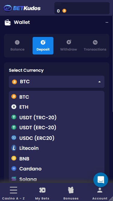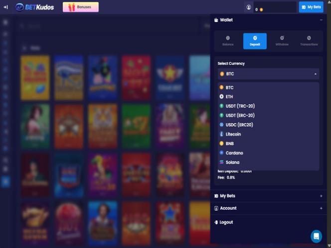 In order to make deposits, you will have to use some of the cryptocurrency payment options and make deposits in some of the trendy digital coins, including ADA (Cardano), BTC (Bitcoin), ETH (Ethereum), LTC (Litecoin), SOL (Solana), and USDT (Tether).