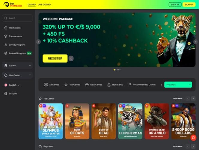 BetPRIMEIRO is a massive gambling site that features an extensive lineup of casino games, including real money slots, live dealers, crash games, and table games, as well as a comprehensive range of sports betting options. The brand invites players from Germany, Canada, and Ireland to its website, promising a well-rounded gaming experience featuring a diverse range of games, generous bonuses, exciting promotions, and cryptocurrency availability.