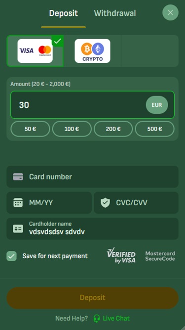 The operator provides players with traditional and modern options for payment methods. Visa, Mastercard, Bank Wire Transfer, and MiFinity are some of the options, but you can deposit and withdraw funds using cryptocurrencies like Bitcoin, Ethereum, Tether, and Tron.