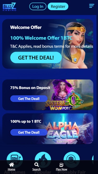 Rich gaming library is organized into Casino and Live Casino sections, and there are also Races and Promotions to spice up punters’ stay at Blizz Casino.