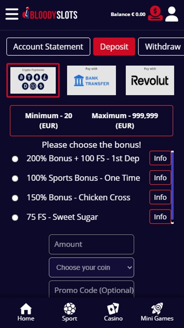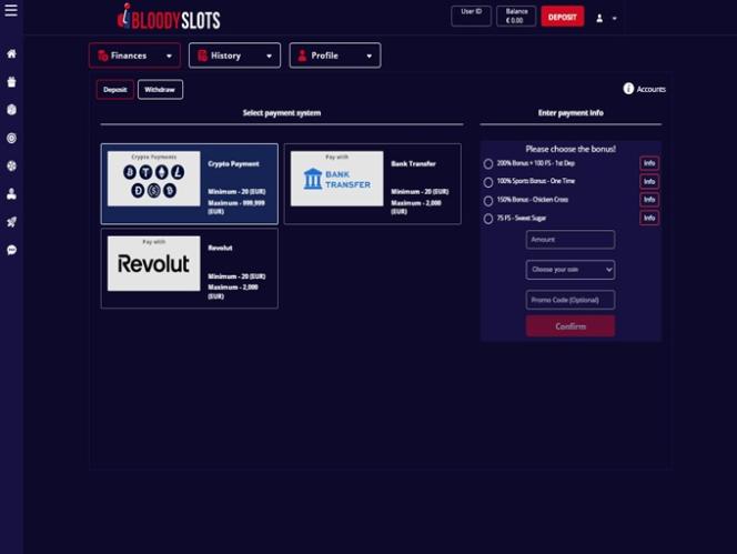 At Bloody Slots, players will have the option of using several payment methods to deposit and withdraw funds from their casino accounts, with some of the popular choices being Visa, Mastercard, Apple Pay, Google Pay, Monzo, Bank Wire Transfer, and Revolut.. The brand also accepts various cryptocurrencies, including Bitcoin, Bitcoin Cash, Ethereum, Litecoin, USD Coin, and Tether.