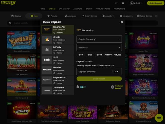 Regarding specific game types and categories, real money slots hold the spot as the most popular player picks at Bluffbet. This is not a surprise, as the casino has managed to attain an impressive lineup of these games. You’ll be able to play through virtually every category and genre you can imagine, including bonus buys, newest releases, classic slots, Megaways, hold n' links, and cluster pays.