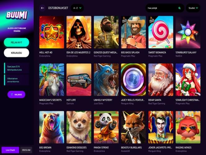 BUUMI collaborates with many top-rated online casino software developers and it makes a proper game selection providing the players with the impressive gaming library size and a plethora of online casino game genres such as:
