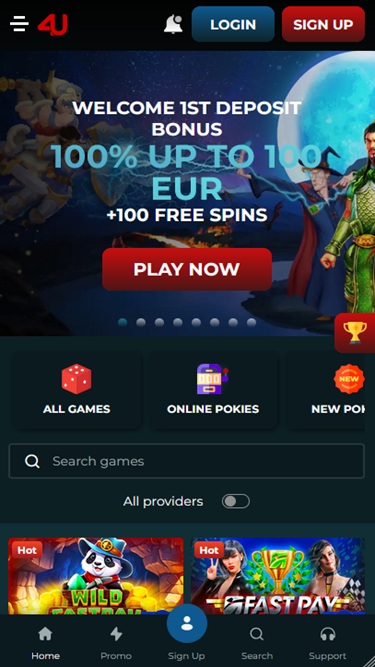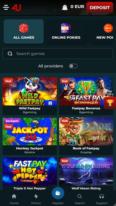 Casino4u is powered by Microgaming, Net Entertainment, Playtech, BetSoft, Amatic Industries, EYECON, Habanero Systems, lightningboxgames, Oryx, Play'n GO, playson, Quickspin, Thunderkick, Yggdrasil, Endorphina, Wazdan, Realistic Games, GameArt, Pragmatic Play, Nolimit City, Booongo, Spinomenal, Red Rake Gaming, Skillzzgaming, Belatra Games, Kalamba, Platipus Gaming, Nucleus Gaming, Triple Edge Studios, BGAMING, Northern Lights Gaming, Evoplay, Stormcraft Studios, IGTech, Bulletproof Games, All41 Studios, Gluck Games, Mascot Gaming, NetGame Entertainment, Gameburger Studios, Pulse 8 Studios, Neon Valley Studios, Golden Rock Studios, Swintt, TrueLab Games, SpinPlay Games, Mancala Gaming, HungryBear Gaming, KA Gaming, GONG Gaming, Holle Games, Buck Stakes Entertainment, Games Global, Reevo, Amusnet Interactive, Ash Gaming, CT Interactive, Tom Horn Gaming, Mr Slotty, Old Skool Studios, Foxium, Just For The Win, Reflex Gaming, PearFiction Studios, Wild Streak Gaming, Slingshot Studios, Fortune Factory Studios, Gamevy, Crazy Tooth Studio, ReelPlay, Japan Technicals Games, Alchemy Gaming, Rarestone Gaming, Snowborn Games, Boomerang Studios, Max Win Gaming, Gold Coin Studios, Bang Bang Games, Half Pixel Studios, Arcadem, Peter And Sons, Eurostar Studios, Aurum Signature Studios, Onlyplay, Area Vegas, 3 Oaks Gaming, Wishbone Games, Apparat Gaming, Circular Arrow, Bet2Tech, HammerTime Games, INO Games, Nailed It! Games, Atomic Slot Lab, Reel Kingdom, Oros Gaming and Popiplay and the casino’s games are supplied using a web-based platform. The site is easy to navigate and has buttons that let you choose games by provider. Mobile support is included as well, letting you play on your phone or tablet if you wish.Blackjack