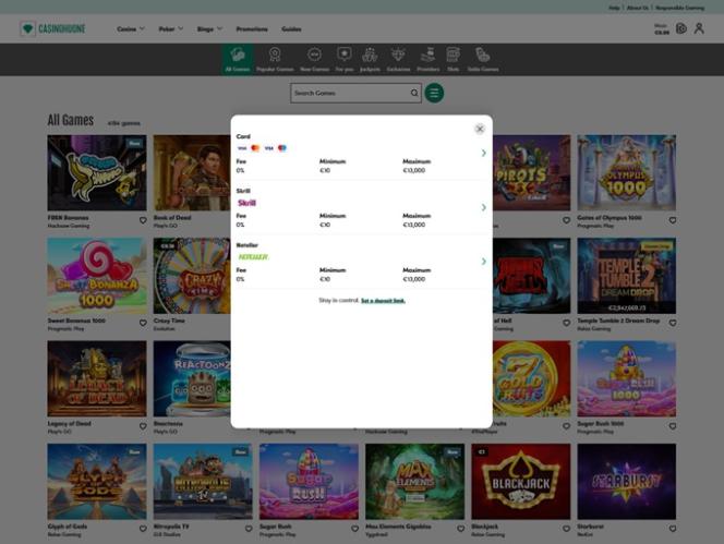 Casinohuone is powered by Microgaming, Net Entertainment, Playtech, 1x2gaming, Barcrest, Big Time Gaming, ELK Studios, Evolution Gaming, lightningboxgames, Novomatic, Oryx, Play'n GO, playson, Quickspin, Rabcat, Relax Gaming, Thunderkick, Yggdrasil, Booming Games, Stakelogic, Pragmatic Play, Nolimit City, Felt Gaming, GAMING1, Red Tiger Gaming, Fantasma Games, Kalamba, Spin Games, Skywind, Triple Edge Studios, Northern Lights Gaming, Stormcraft Studios, Electric Elephant Games, Pocket Games Soft, Bulletproof Games, All41 Studios, Gluck Games, Gameburger Studios, Pulse 8 Studios, Neon Valley Studios, Golden Rock Studios, Shuffle Master, SpinPlay Games, GONG Gaming, Blue Guru Games, Buck Stakes Entertainment, Design Works Gaming, Games Global, Bally Technologies, bluberi, Blueprint Gaming, Greentube, Leander Games, NextGen, Push Gaming, WMS, Inspired Gaming, SG Interactive, Gamomat, Red7Mobile, Scientific Games, Reel Time Gaming, BF Games, Iron Dog Studio, Foxium, Just For The Win, Storm Gaming Technology, PearFiction Studios, Wild Streak Gaming, Slingshot Studios, Fortune Factory Studios, Jade Rabbit Gaming, 4ThePlayer, AvatarUX, Gamevy, Crazy Tooth Studio, NetGaming, ReelPlay, Alchemy Gaming, Rarestone Gaming, Black Pudding Games, Snowborn Games, Boomerang Studios, Hacksaw Gaming, Max Win Gaming, Gold Coin Studios, Bang Bang Games, Peter And Sons, Aurum Signature Studios, Lucksome Gaming, Area Vegas, RAW iGaming, Spribe, Circular Arrow, Print Studios, Gaming Corps, HammerTime Games, Four Leaf Gaming and INO Games, which is provided through a web-based platform. A mobile site is also available, which allows you to play via your smartphone and tablet.