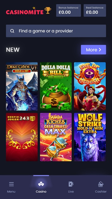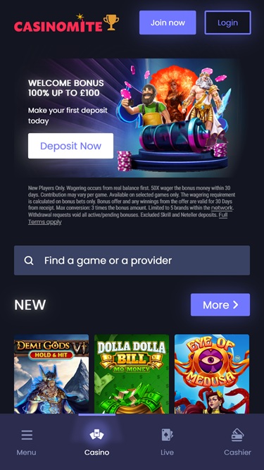 Launched in 2024, Casinomite is a massive online casino that features an extensive lineup of gambling games for its players to enjoy, including real money slots, live dealers, instant crash games, and table games. The brand primarily welcomes players from Finland and the United Kingdom, and promises to provide them with a complete gambling experience filled with various games and numerous promotions and bonuses.