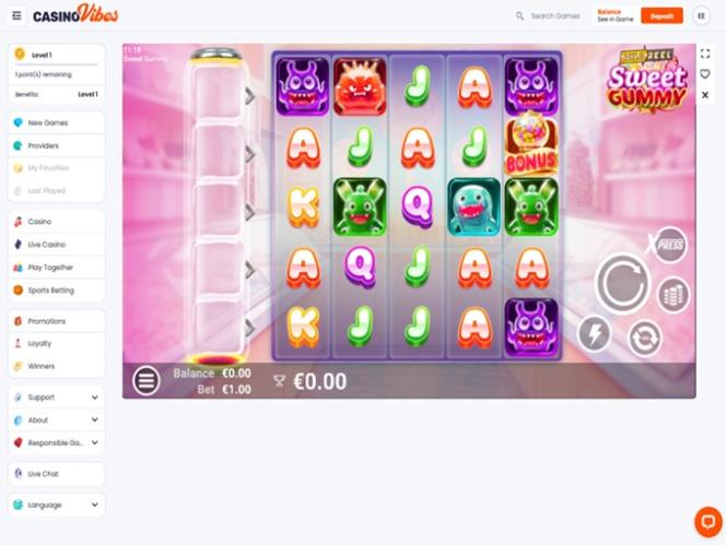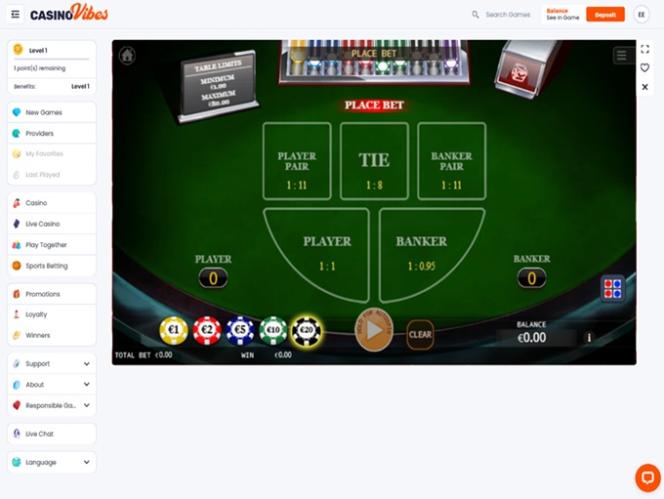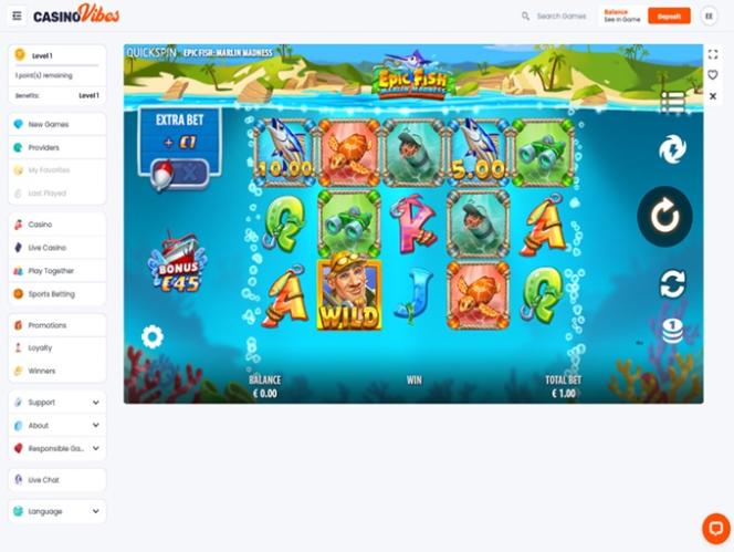 At CasinoVibes, players can participate in the loyalty program where they can earn coins and progress through levels. The bigger the level you are, the more coins you will get, which can later be exchanged for cash prizes.