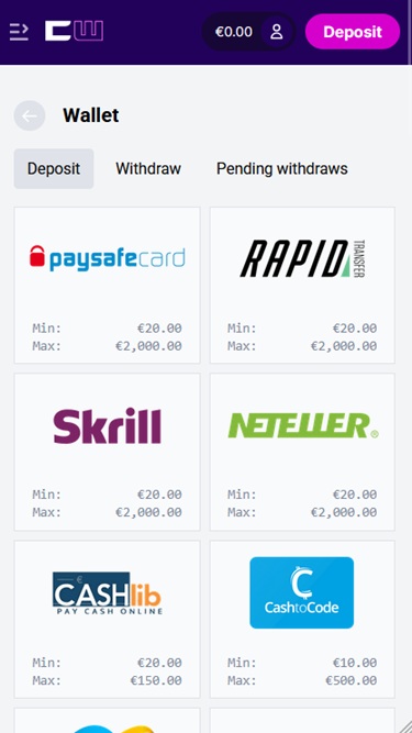 💰 Min Deposit€10 (CashToCode)/€20 (Other methods)