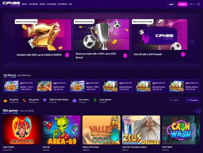 Cipher Wins is a modern gambling site with a diverse selection of casino games, including real money slots, live dealers, crash games, and table games. The casino features an extensive sports betting section, which provides numerous betting options to users, as well as a comprehensive promotional program featuring multiple bonuses and promotions for players to take advantage of and enjoy