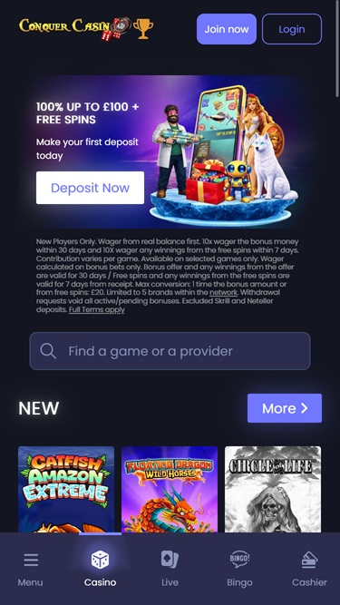 AwesomeI personally think that time spent on Conquer casino site can be really entertaining you can find here many attractions including over 10-12 games providers what means just galore of games to choose from. Low deposit accepted via most popular methods and cash outs which might require small verification.