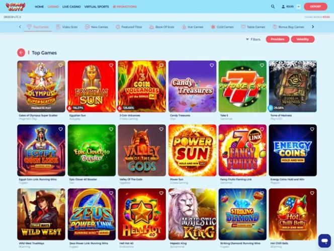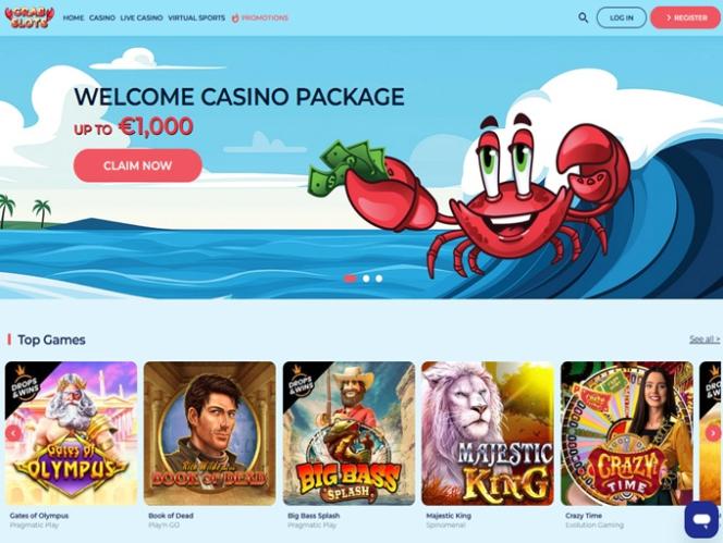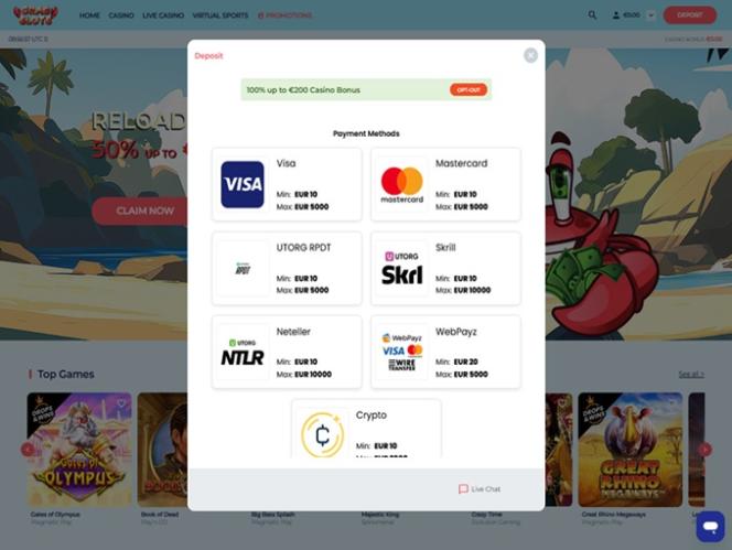 Loading up the website, you are greeted with a light-blue theme that’s soothing to the eye, and, of course, a crab. The top left side of the page is reserved for home, casino, live casino, virtual sports and promotions menu. On the other side - the right side of the page you will find your account balance and deposit menu, or log in/register buttons if you aren’t logged in yet.