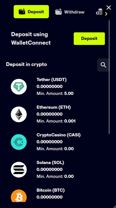 Players without cryptocurrency experience can purchase crypto directly from the website using traditional payment options such as Visa and Mastercard.