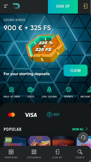 The art direction of DRIP Casino is something to be admired, as we rarely come across an environment that looks like this. The color palette contrasts beautifully between black and dark green colors. Nothing on this website is going to give you an eye soar, as every single section is clearly visible.