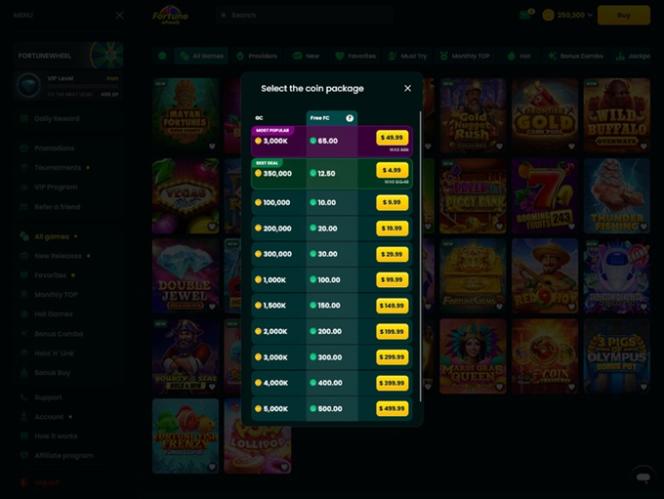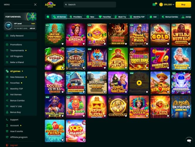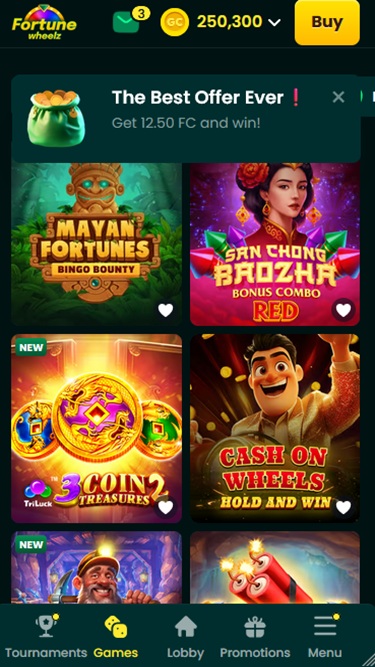 We think players will appreciate what the designers of Fortune Wheelz Casino social gaming site accomplished with the website’s appearance, just as we did. The casino aims to provide players with a minimalist user experience that perfectly balances the appealing color palette of dark green backgrounds and yellow shades with an intuitive interface that even beginners won’t have problems with.