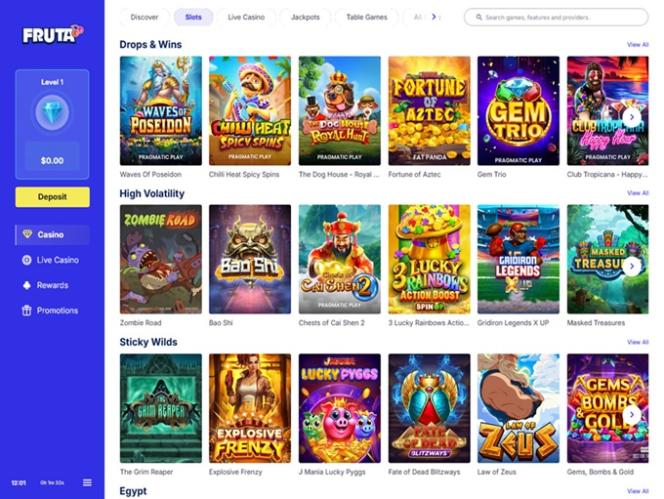 Fruta Casino hosts an amazing online slots collection. This gaming library is superbly organized, and it includes subcategories such as High Volatility, Sticky Wilds, Egypt, Free Spins Feature, Colossal Symbols, Re-spins, Joker, Asia, Falling Symbols, Multiplying Wilds, Random Wilds, Classic Slots, Sports, Scratch Cards, Bonus Buy, and more.
