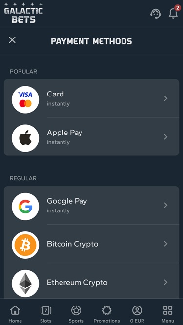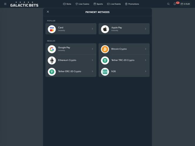 To elevate your gaming sessions to a new level, GalacticBets has also devised a competent promotional plan that features a ton of bonuses, promotions, and events you can participate in. Players can claim the welcome bonus, earn weekly cashback, receive loyalty rewards, or claim reload bonuses throughout their stay.