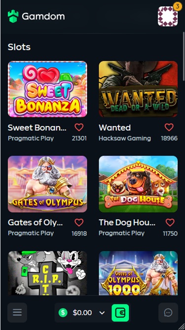 Gamdom’s popular online slot titles are: Swet Bonanza, The Dog House, Book of Dead, Money Train 2, Fruit Party, Gates of Olympus, Deadwood, Sweet Bonanza Xmas, Book of Shadows, Legacy of Dead, Rich Wilde and the Tome of Madness, The Dog House Megaways, Gems Bonanza, Chaos Crew, Razor Shark, Big Bass Bonanza, Reactoonz, Rise of Merlin, Wild West Gold, Jammin Jars, Book of Sun Choice, Snake Arena, Release of Kraken Honey Rush, The Hand of Midas, Mystery Museum, Money Train, Tomb Stone, San Quentin, Fire in the Hole, Madame Destiny Megaways, Floating Dragon Hold and Spin, Roman Legion, Iron Bank, No Limit Punk Rocker, Return of Kong Megaways Rosh Immortality Cube Megaways, Jucy Friots, Wolf Gold...