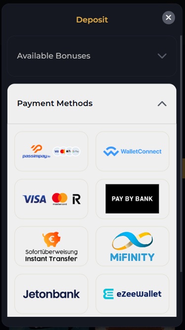 Promotions that can be accessed by clicking on the Promotions button positioned in the upper right corner, through the Deposit section or the Available Bonuses tab, are: