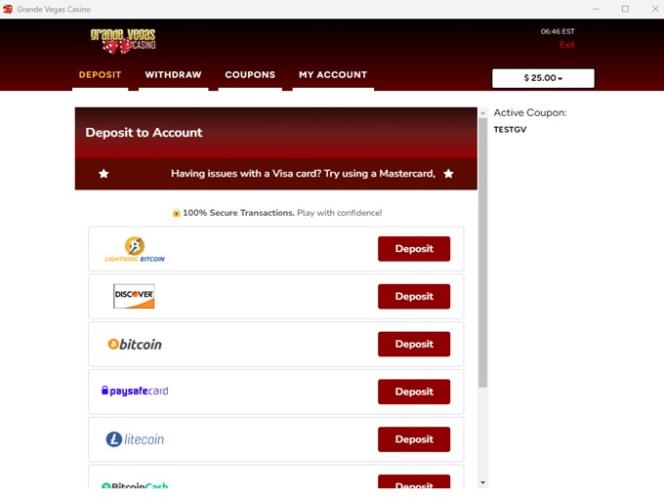 Grande Vegas Casino is powered by Real Time Gaming and Spinlogic Gaming, which provides several dozen games to players throughout the world. The casino is available through a downloadable piece of software as well as a web based platform that allows for instant play.