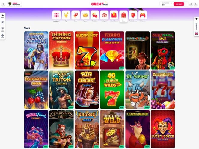 Slot games recommended by GREATwin Casino are: Piggy Bjorn – Muspelheim’s Treasure, El Toreo, El Cowboy Megaways, Bobby Woods, Book of Secrets, Elven Princesses, Mega Greatest Catch, 40 Sevens, Arabian Secret, Surfin' Joker, Out Of The Ice, Royal Potato, Book of Destiny, Crystal Golem, Wazamba, Amazon Kingdom, Gates of Olympus, Bigger Bass Bonanza, 1 Million Fortunes Megaways, Book Of Rampage, Power of Gods: Hades, Jaguar Princess, Big Bad Wolf Megaways, Lion's Hoard, Razor Shark, Figaro, Lucky Rooster, Book of Sun: Choice, Great Book of Magic, Book of Sirens - Golden Pearl, The Bowery Boys, Reno 7's, The Mystery of Eldorado, San Quentin xWays, Big Bass Bonanza, Joker Win, Fire In The Hole xBomb, Fat Drac, Siberian Wolf, Sweet Bonanza, Sakura Fortune, Black Wolf: Hold and Win, Wolf Fang, It's Joker, Ramses Rising, Buffalo Power Hold and Win, Golden Glyph 2, Deadwood xNudge, Jammin’Jars, Sticky Bandits: Wild Return, Book of Diamonds, Tiger's Glory, 10000 Wishes, Cube Mania Deluxe, Cube Mania, Hallow Pick, Super Sevens & Fruits 6 Reels, 8 Golden Skulls of Holly Roger Megaways Firepot, Treasures Of Lion City, Retro Galaxy, Bushi Sushi, Dark Reels, Well Of Wilds Megaways, Piggy Bank Bills, Atlantis Ca$h Collect, Retro Pumpkin...
