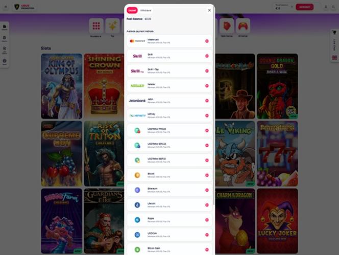 The “Cashier” section provides various payment choices available in their gambling jurisdiction, including crypto banking methods, prepaid, credit and debit cards, e-wallets, instant bank transfers…