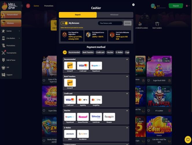 HellSpin Casino supports a large number of widely used payment methods that gamblers can choose for their deposits and withdrawals. The Cashier includes credit and debit cards, popular e-wallets such as Skrill and Neteller, cryptocurrency banking options and other online payment systems:
