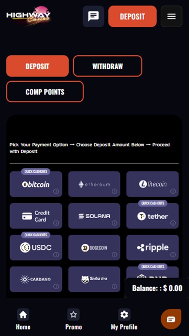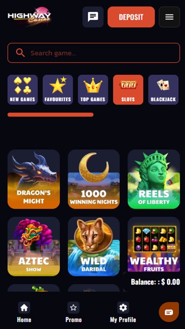 Highway Casino is powered by Real Time Gaming, BetSoft, Rival, Saucify, Visionary iGaming, Betgames, Nucleus Gaming, Spadegaming, BGAMING, Genii, Wager Gaming, Dragon Gaming, FastSpin, Dragoon Soft and Urgent Games and the site’s games are all supplied through your internet browser. The site is attractive and easy to navigate, and there’s a search bar that’s good for finding particular games. Highway fully supports mobile play, too, so you can play on your phone or tablet if you want.Other Games