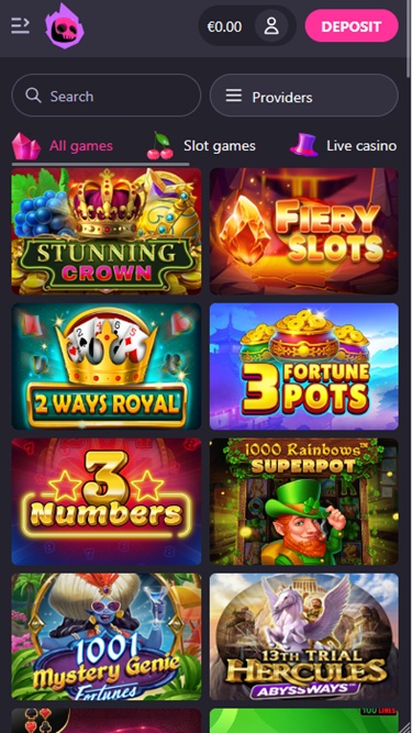 Slots include Stunning Crown, Fiery Slots, 1001 Mystery Genie Fortunes, 20 Blazing Clover, 12 Animals, Age of Legends, Anubis Wrath, Barbarossa Revenge, Turbo Play, White Witch, Bank Run, Book Hotfire, Lizard Loot, Coins of Ra, Alibi, Boom Farm, 13th Trial Hercules, Blood Club, Cauldron, Frozen Age and more!