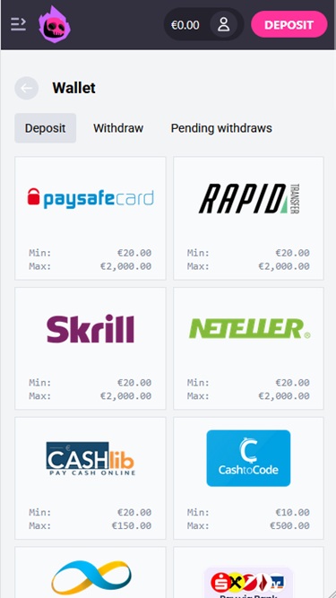 💰 Min Deposit€10 (CashtoCode)/€20 (Other methods)