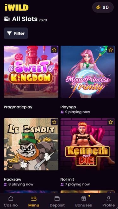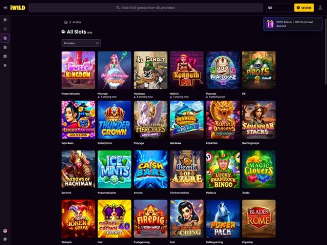 The most popular titles at iWild are: The Dog House, Pets, Sugar Pop!, The Prancing Pony, Sunny Fruits: Hold and Win, Super sevens & fruits, Buffalo Power: Hold and Win, Chilli Pop, Gods of Olympus Megaways, Dragon`s Treasure, Red Hot Chili 7`s, Golden Fruits, Disco Fruits, Dragons of the North, Fortune Dragons, Stallion Fortunes, Super Sweets, Hell’ Sing, Kitsune`s Scrolls, Heroes & Legends - King of the Trident Deluxe, Pachin Girl, The Dragon Tiger, Hope Diamond, Wheel of Time, Western Reels, Vegas Nights, Valley of Dreams, USSR 70`s, USSR Grocery, Trip To The Future, Totem Island, Thimbles, The Slavs, The Legend of Shaolin, The Great Conflict, The Emperor`s Tomb, Talismans of Fortune, Syndicate, Surf Zone, Sprinkle, Sindbad, Season Sisters, Sea of Spins, Scratch Match, Roll The Dice, Rocket Stars, Rock vs Paper Scissors, Robots: Energy Conflict, Robinson, Robin Hood, Rise of Horus, Rich Reels, Reign of Dragons, Red Queen, Red Cliff, Raccoon Tales, Prohibition, Penalty Shoot Out, Nuke World, Night of the Living Tales..