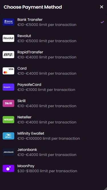 Besides the cryptocurrency payment methods, punters may use all other standard banking options such as payment cards and e-wallets.